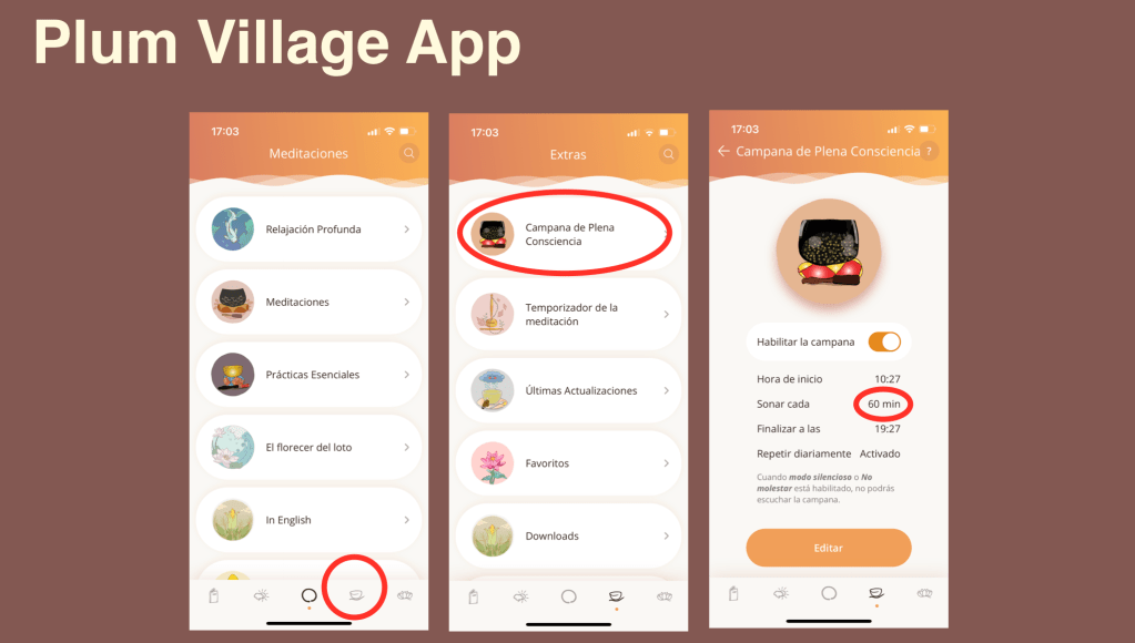 Descarga la app de Plum Village y activa la campana de la plena consciencia para que suene cada hora. Cada vez que suene la campana, haz una pausa para respirar 3 veces con total atención a la respiración.